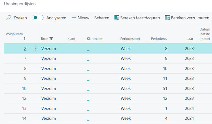 Het is mogelijk om op de pagina Urenimportlijsten een filter in te stellen op Bron is Verzuim en dat filter op te slaan, zodat u een overzicht hebt van urenimports die via dit rapport zijn aangemaakt.