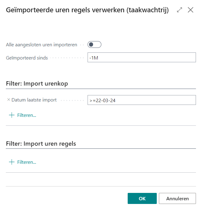 Standaard is in dit veld de datumformule -1M ingesteld, zodat alleen urenimportregels worden verwerkt die afgelopen maand zijn geïmporteerd. Wilt u een andere periode, dan past u de datumformule aan.