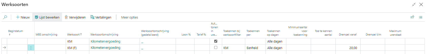 Werksoort | Toekennen bij werksoortfilter | Toekennen per | Toekennen op dagen | Drempelvanaf | Drempel t/m |