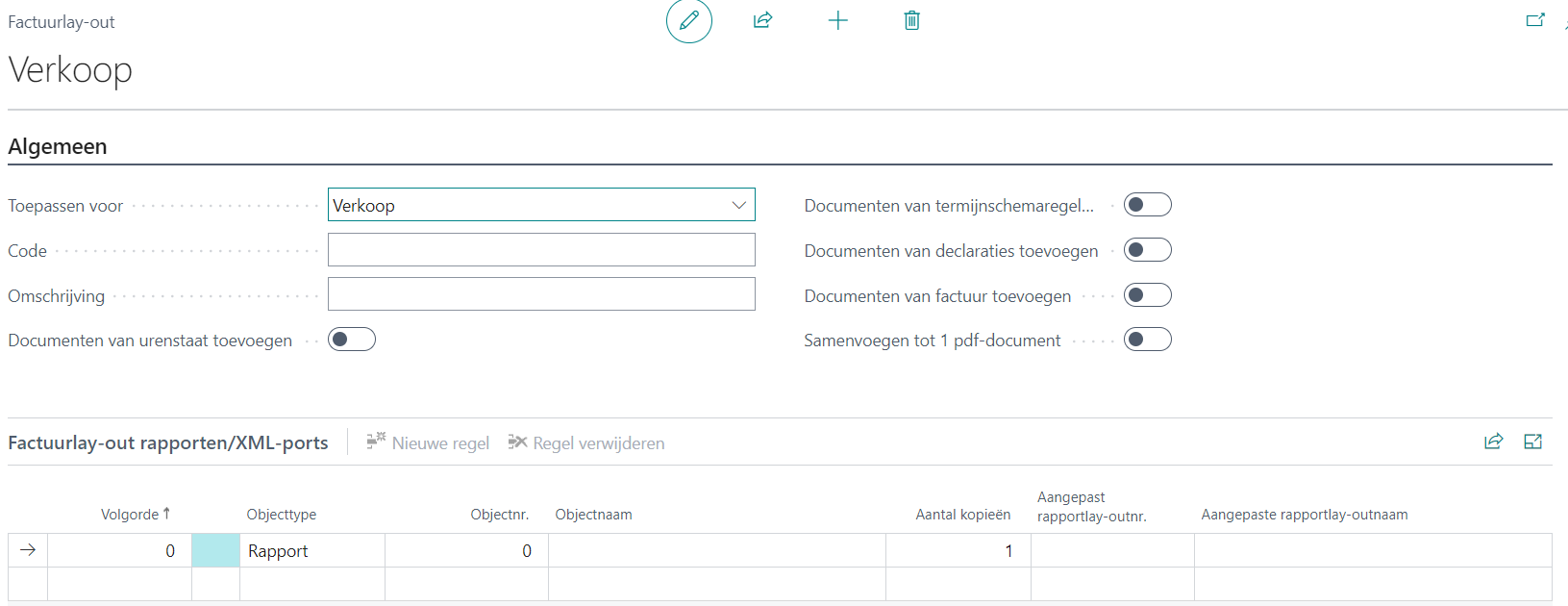- Klik in de sneltab Factuurlay-out rapporten/XML-ports in de eerste, lege regel en vul in het veld Objectnr. het rapportnummer in dat van toepassing is.