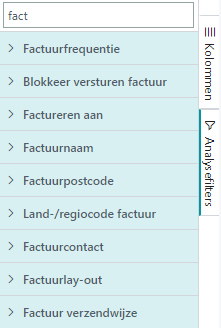 Is er een groot aantal velden waarop gefilterd kan worden, begin dan eerst met een algemeen filter op de velden. In onderstaande is gefilterd op fact waarmee alleen de filtervelden worden getoond waar ‘fact’ in voorkomt.