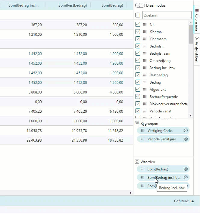 In deze modus kunt meer draaitabelachtige analyses maken. Het is dan niet meer mogelijk om de individuele records te openen. Dus een geboekte factuur zoals in het voorgaande voorbeeld is niet meer direct te openen.