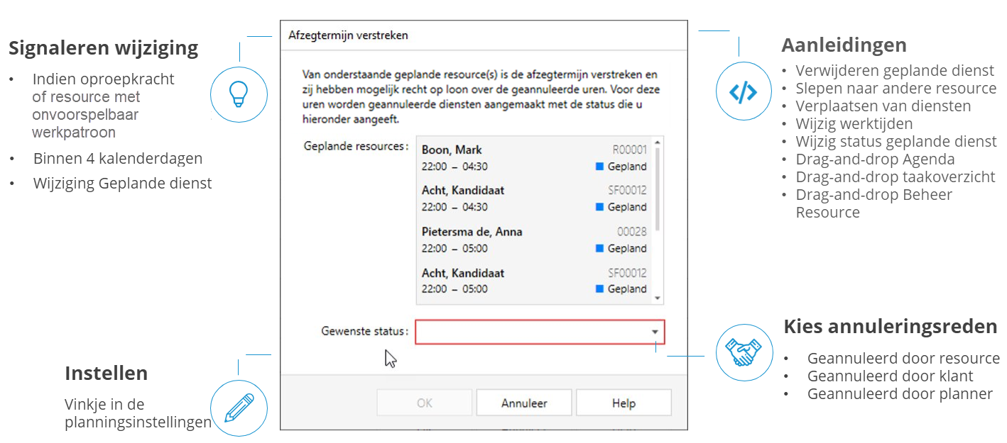 - toont de pagina Afzegtermijn verstreken een waarschuwing plus de vraag welke annuleringsstatus de te annuleren uren moeten krijgen.