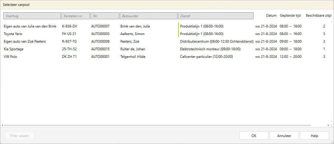 Opmerking: Bij auto's die op dezelfde dienst zijn ingepland staat een groene balk.