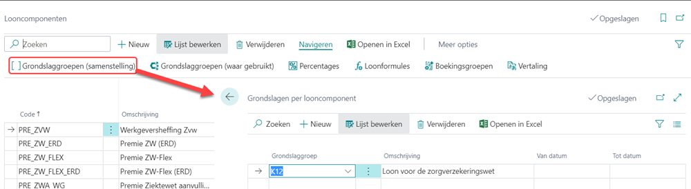 Per looncomponent geeft u op over welke grondslaggroep het percentage moet worden toegepast. Klik daarvoor op de actiebalk onder Navigeren op Grondslaggroepen (samenstelling).