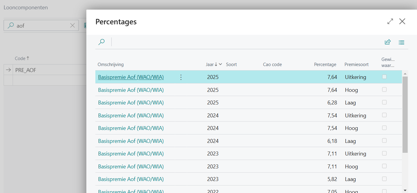 Het premiepercentage van het Arbeidsongeschiktheidsfonds (Aof) wordt (sinds 2022) gedifferentieerd naar een lage premie voor kleine werkgevers en een hoge premie voor (middel)grote werkgevers. In 2025 is de hoge premie 7,64% en de lage premie 6,28% (in 2024 hoog 7,54%, laag 6,18%).