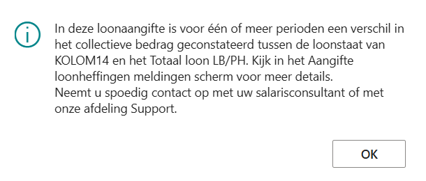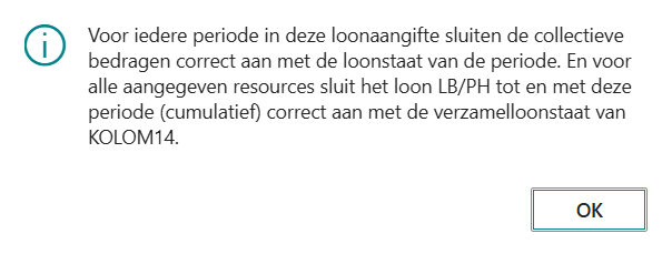 Controle nog niet mogelijkKlikt u op de knop terwijl de loonaangifte de status Initieel, Aanmaken of Opnieuw aanmaken heeft, dan krijgt u deze melding: