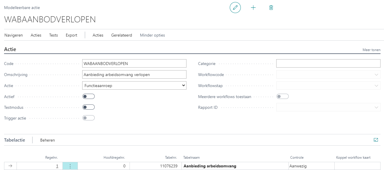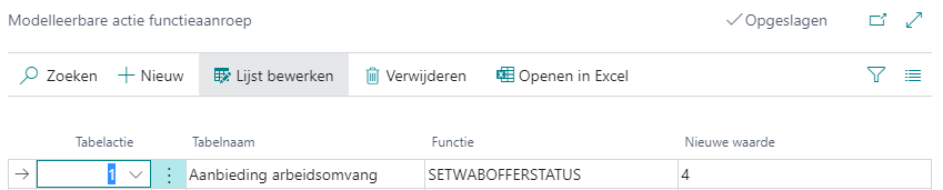 Het is mogelijk om een modelleerbare actie (MA) in richten om de status van een aanbieding arbeidsomvang om te zetten. Hiermee kan bijvoorbeeld vanuit de taakwachtrij automatisch een aanbieding arbeidsomvang op status Verlopen worden gezet als de resource een maand na aanbieden niet heeft gereageerd.