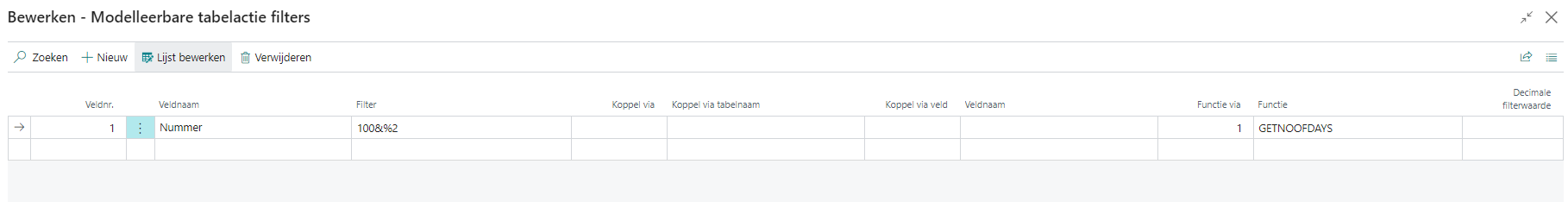 Selecteer dan de regel met tabel Integer en klik in de actiebalk van de sneltab op de knop Filters. Vul het veld Veldnr. met 1, vul het veld Functie via met 1 en selecteer in het veld Functie de waarde Get No of Days. In het veld Filter stelt u het gewenste aantal dagen in met daarachter &%2. %2 verwijst naar de uitkomst van de functie. Bijvoorbeeld 14&%2 of 56&%2. Het is ook mogelijk om een bereik (bijvoorbeeld 52..59) op te geven: 52..59&%2.