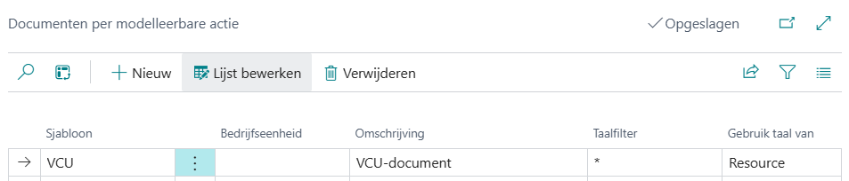 Stel het documentsjabloon in dat het document moet genereren. Zie ook Pagina Documenten per modelleerbare actie.