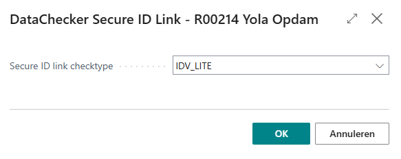 Opmerking: Als op de pagina Externe datavalidatiesystemen setup het veld Secure ID link gebruik aanvraagpagina niet is ingeschakeld, wordt de Secure ID link direct verstuurd als u op de knop Secure ID Link verzenden klikt. Hierbij wordt uitgegaan van de instelling in het veld Secure ID link checktype op de pagina Externe datavalidatiesystemen setup.