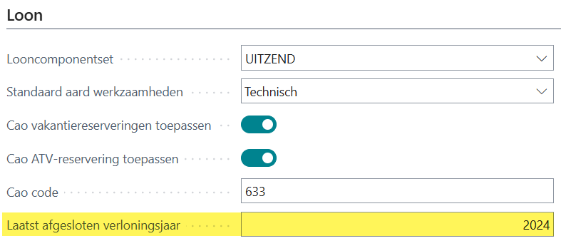 U sluit een loonjaar af door het jaartal in te vullen in het veld Laatst afgesloten verloningsjaar op de bedrijfseenheid. U kunt alleen het jaartal van vorig jaar invoeren (op basis van de werkdatum).