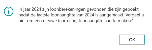 Afsluiten kan alleen als er geen ongeboekte loonberekeningen meer aanwezig zijn voor het loonjaar dat afgesloten moet worden. Daarnaast vindt een controle plaats of er na de laatst aangemaakte loonaangifte van het af te sluiten loonjaar nog loonberekeningen voor dat jaar zijn geboekt. In dat geval krijgt u een melding.
