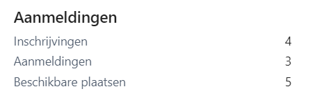 Het feitenblok Aanmeldingen op de opleidingenkaart toont het aantal inschrijvingen, het aantal aanmeldingen en het aantal nog beschikbare plaatsen.