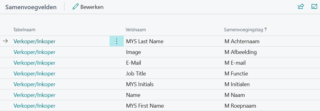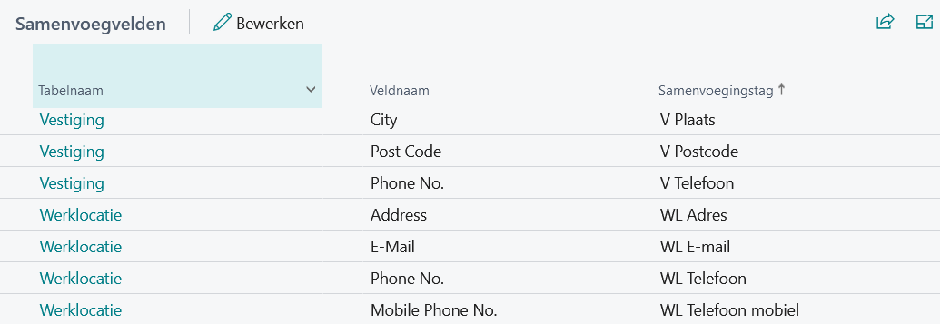 Via de knop Bewerken opent u de pagina Samenvoegvelden, waarin u nieuwe samenvoegvelden kunt toevoegen (als u daar rechten voor hebt).