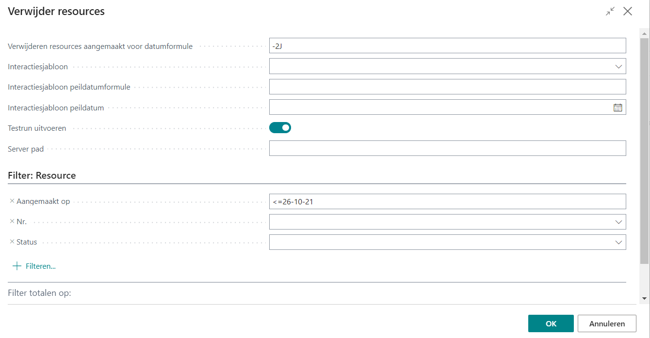 Standaard is de optie Testrun uitvoeren ingeschakeld. Dit houdt in dat het rapport alleen een controle uitvoert of er resources aanwezig zijn die voldoen aan de ingestelde filters. Is de optie Testrun uitvoeren niet ingeschakeld, dan zal het rapport daadwerkelijk de betreffende resources met bijbehorende gegevens VERWIJDEREN.