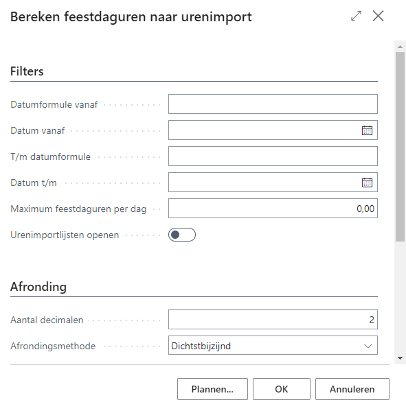 - vanuit de pagina Urenimportlijsten via de knop Bereken feestdaguren.