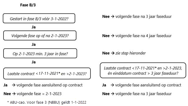 Aow'ers Als het contract eindigt op de dag waarop de resource de AOW-gerechtigde leeftijd bereikt en de AOW-gerechtigde resource gaat binnen 6 maanden en 2 dagen weer aan de slag voor de uitzendonderneming, dan start de telling opnieuw in fase B/3. Opmerking: Als het contract vóór of na de dag eindigt waarop de resource de AOW-gerechtigde leeftijd bereikt en de AOW-gerechtigde resource gaat binnen 6 maanden en 2 dagen weer aan de slag voor de uitzendonderneming, dan is de normale fasetelling van toepassing. |