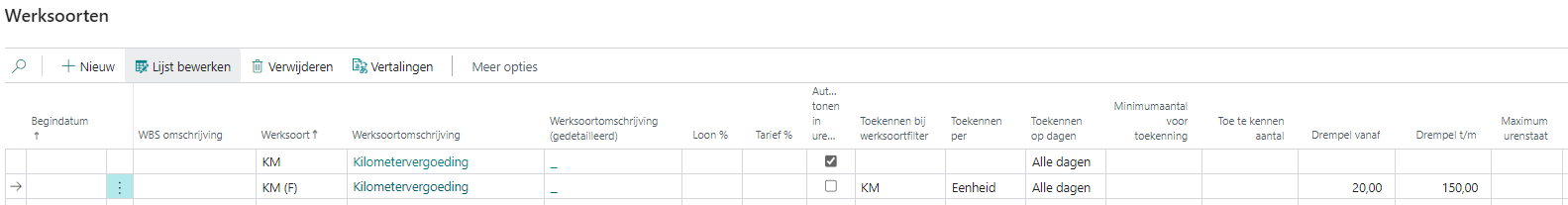 Werksoort | Toekennen bij werksoortfilter | Toekennen per | Toekennen op dagen | Drempelvanaf | Drempel t/m |