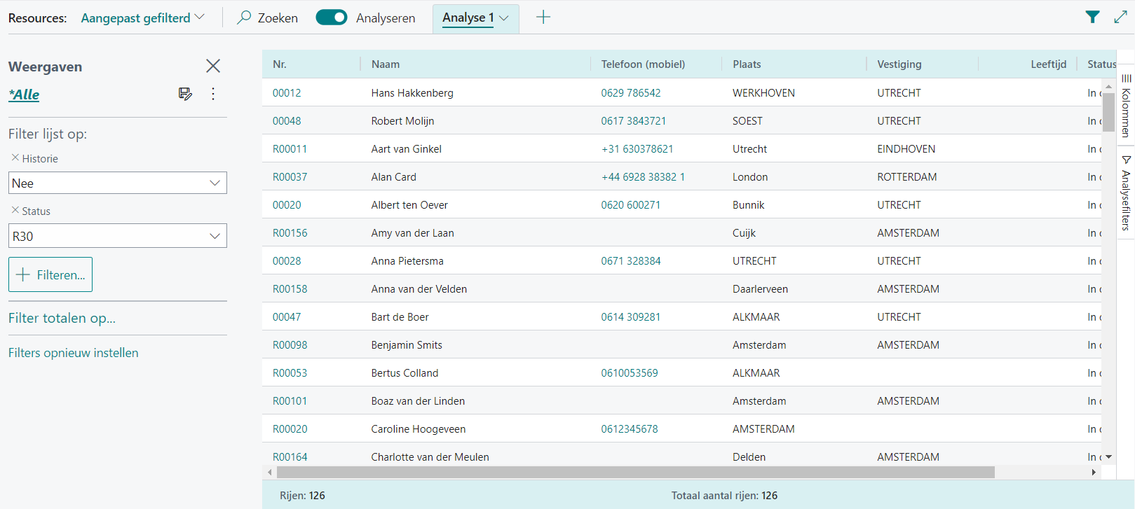 Zie onderstaand voorbeeld waarbij gefilterd is op resourcestatus R30. Te zien is dat er 126 resources zijn met die status.