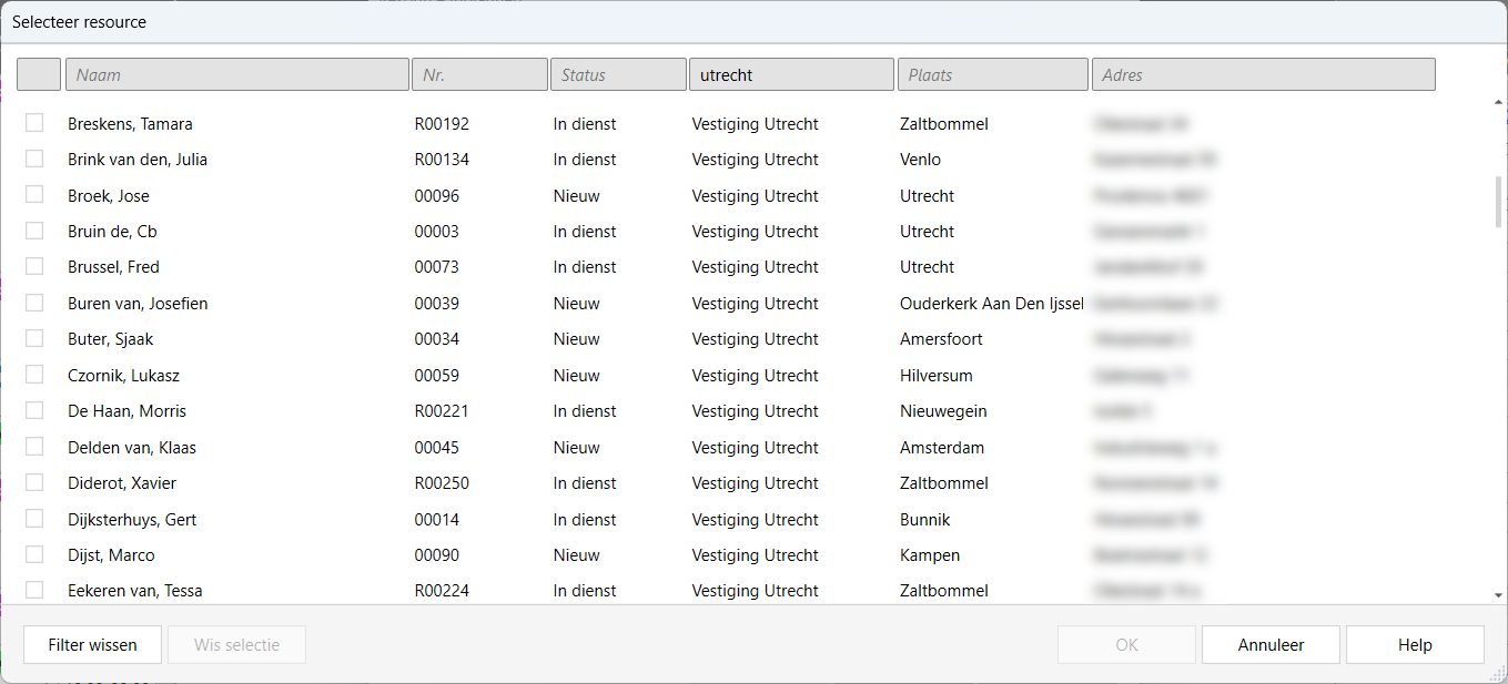 Als u een of meer resources gaat inplannen op een dienst en in het veld Resource(s) van de pagina Resource inplannen op het vergrootglasicoontje klikt, opent de pagina Selecteer resource met alle resources.