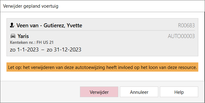 Let op: Als op de autokaart in de sneltab Autotoewijzing het veld Status salarisverwerking op Actief staat en u gaat de voertuigtoewijzing verwijderen vanuit de planningmodule, dan kan dat leiden tot loonberekeningen met terugwerkende kracht (TWK-berekeningen). Daarom bevat de pagina Verwijder gepland voertuig in die situatie de volgende melding: