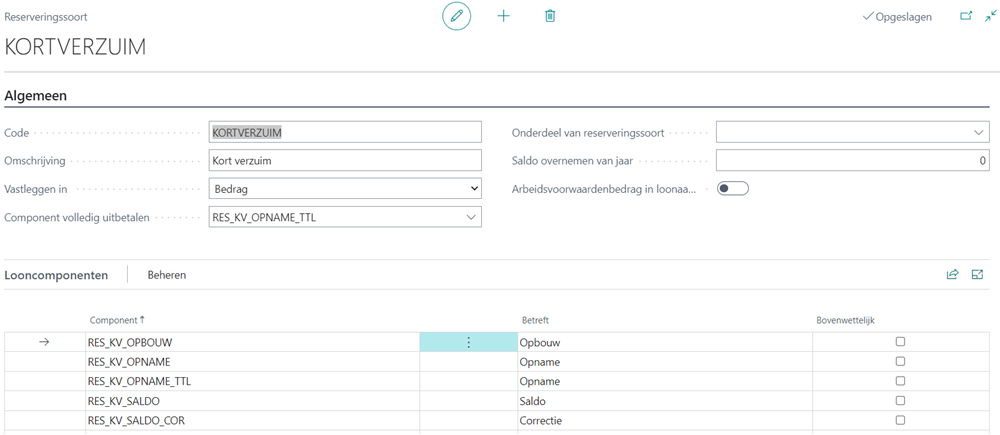 een reservering voor kort verzuim (0,6%) - dit percentage is hard coded ingesteld in de looncomponent RES_KV_OPBOUW