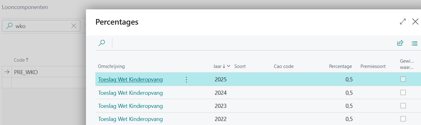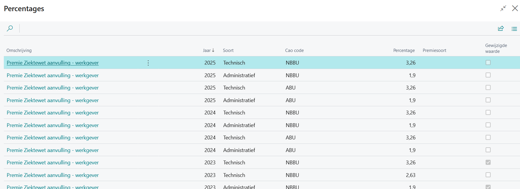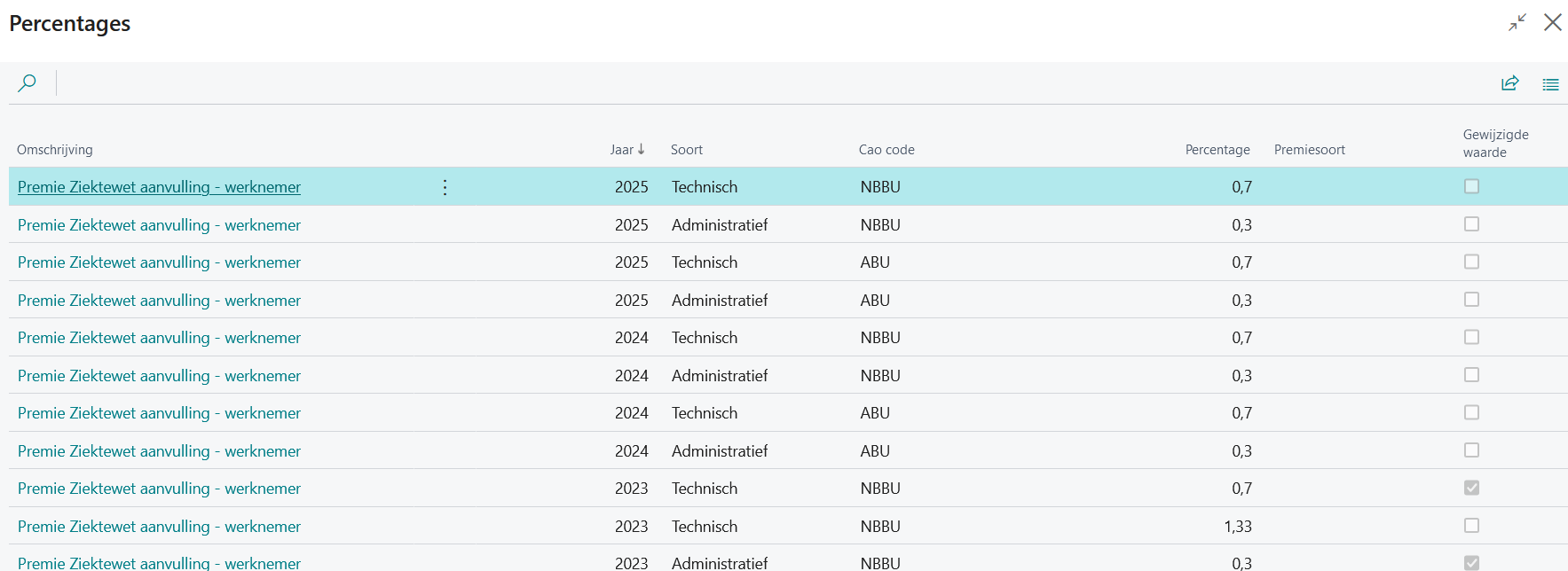 De maximumpercentages die voor deze verzekering c.q. voorziening op het feitelijk loon van de uitzendkracht mogen worden ingehouden, zijn per 1 juli 2023 gewijzigd. De pagina Percentages bevat voor 2023 daarom voor zowel Administratief als Technisch 2 percentages. In de regel met het percentage per 1 juli 2023 is de optie Gewijzigde waarde aangevinkt.