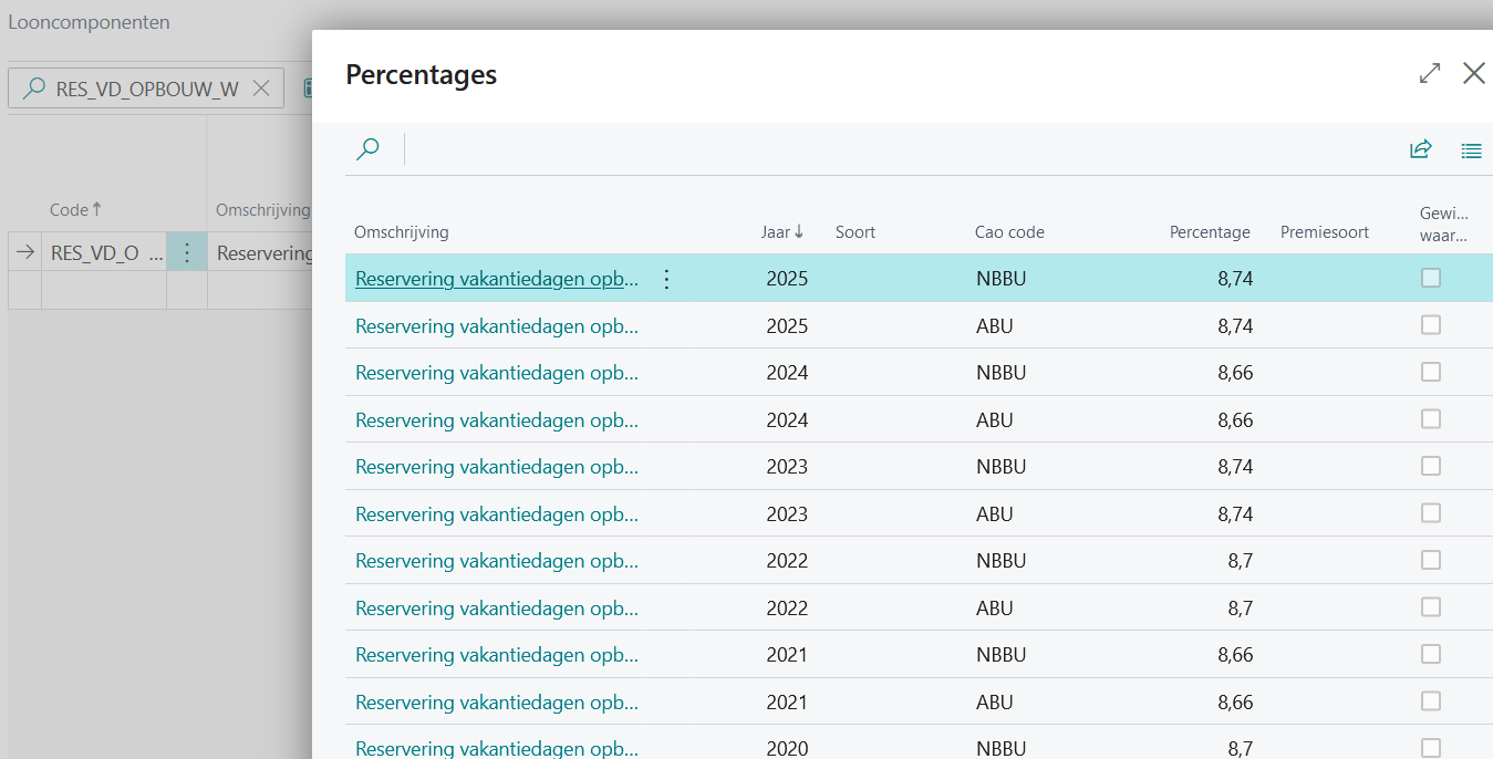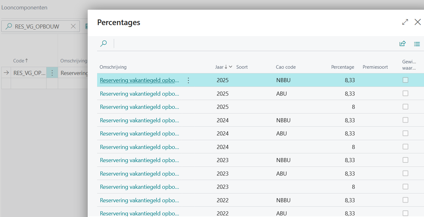 In de standaard looncomponent voor de opbouw van vakantiegeld wordt vanaf 2020 voor cao's ABU en NBBU een vakantiebijslagpercentage van 8,33% toegepast. Voor andere cao's wordt 8% toegepast. Welke cao wordt toegepast is afhankelijk van de cao-code op de bedrijfseenheid.