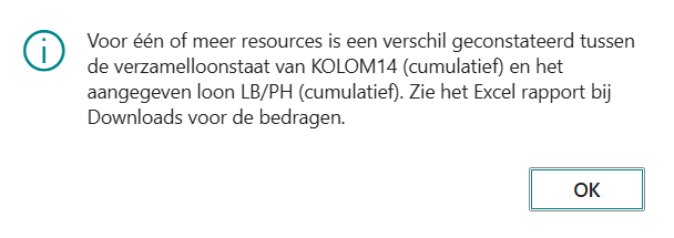 Daarnaast wordt een Excel-bestand gegenereerd en gedownload met daarin de geconstateerde verschillen. Het veld Aansluiting met loonstaat op de loonaangiftekaart wordt gevuld met Gefaald.