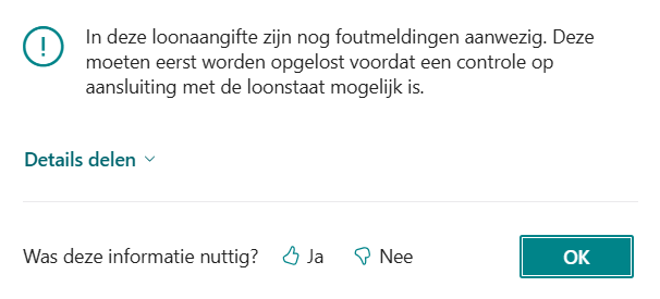 Aangifte met foutenDe aansluiting kan pas worden gemaakt als de loonaangifte geen fouten (meer) bevat. Klikt u op de knop terwijl de aangifte nog foutmeldingen bevat, dan krijgt u deze melding: