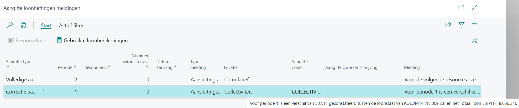 "Voor de volgende resources is een verschil geconstateerd tussen de verzamelloonstaat van KOLOM14 (cumulatief) en het aangegeven loon LB/PH (cumulatief). Zie het Excel rapport voor de bedragen. [Resourcenummer(s)]"