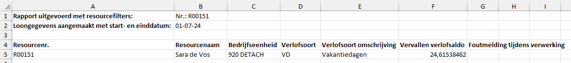 Klik vervolgens op OK. Na het voltooien opent een Excel-bestand met daarin een overzicht van resources die binnen de ingestelde filters vallen met per resource het vervallen verlof saldo.
