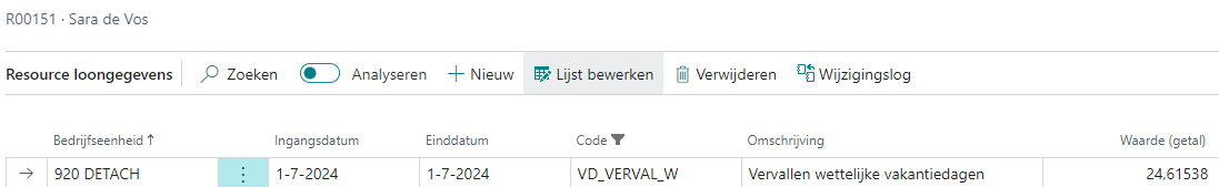 Op de pagina Resource loongegevens van de betreffende resources is een regel toegevoegd met het loongegeven en het bijbehorende saldo.