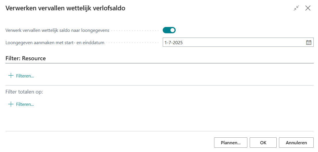 U kunt het te vervallen saldo wegschrijven naar een loongegeven op de pagina Resource loongegevens van de betreffende resources. Activeer daartoe de optie Verwerk vervallen wettelijk saldo naar loongegevens.