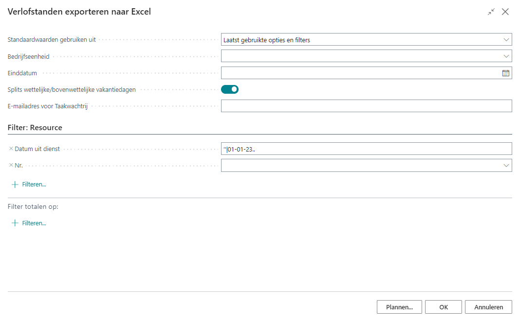 Het filterveld Datum uit dienst is standaard ingevuld zodat in het Excel-overzicht alleen resources worden opgenomen waarin het veld Datum uit dienst op de resourcekaart leeg is of waarin een datum in het huidige jaar is ingevuld. Dit kunt u desgewenst aanpassen.