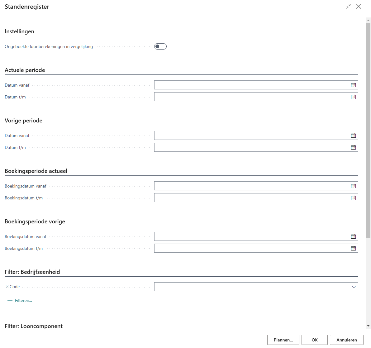 Het is mogelijk om de standen te beperken tot de bedragen die in een bepaalde periode zijn geboekt om daarmee bepaalde correcties uit te sluiten. Via de velden Boekingsdatum vanaf en Boekingsdatum t/m kunt u zowel een actuele als vorige periode opgeven die afwijkt van de opgegeven loonperiode. Het is ook mogelijk om de velden Datum vanaf en Datum t/m leeg te laten en alleen de velden Boekingsdatum vanaf en Boekingsdatum t/m te vullen. Zo kunt u de standen opvragen voor alle in die periode geboekte bedragen ongeacht de loonperiode van de bedragen.