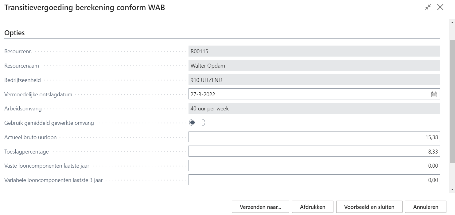 U opent dit rapport door op de actiebalk van de pagina Bereken transitievergoeding onder Acties op Voorbeeld afdruk te klikken.