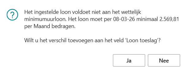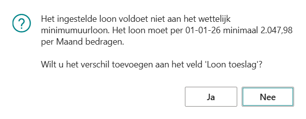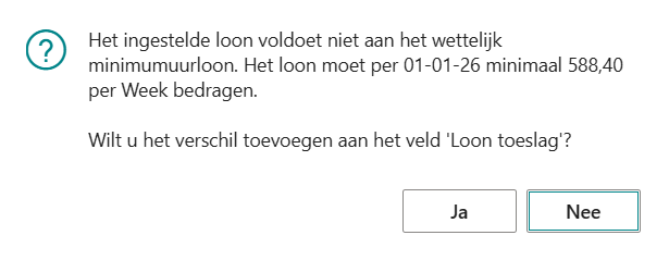 Kiest de gebruiker Ja en is in de sneltab Loon een regel met begindatum 1-1-2026 aanwezig, dan wordt in die regel 9,54 toegevoegd aan het veld Loon toeslag. Heeft de regel in de sneltab Loon geen begindatum, dan wordt een nieuwe regel aangemaakt met begindatum 1-1-2026, loontoeslag 9,54, vast loon 2.550,00 en tijdseenheid Maand.
