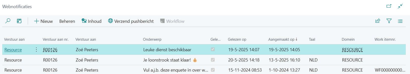 De pagina Webnotificaties toont welke berichten zijn verstuurd naar een resource of contactpersoon, of ze zijn gelezen (geopend) en zo ja, wanneer ze zijn gelezen.