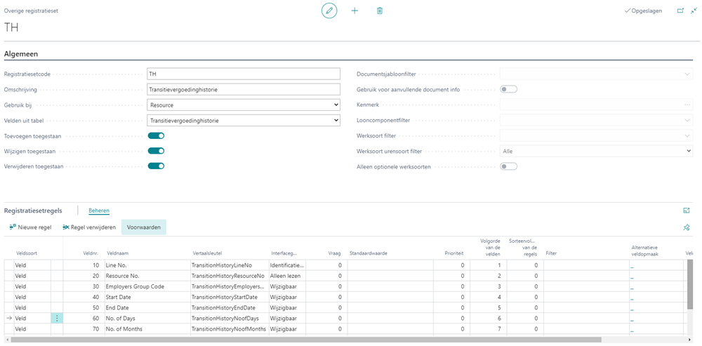 Als voor een regel van een overige registratieset een of meer voorwaarden zijn ingesteld, staat in het veld Voorwaarden aanwezig de waarde Ja.
