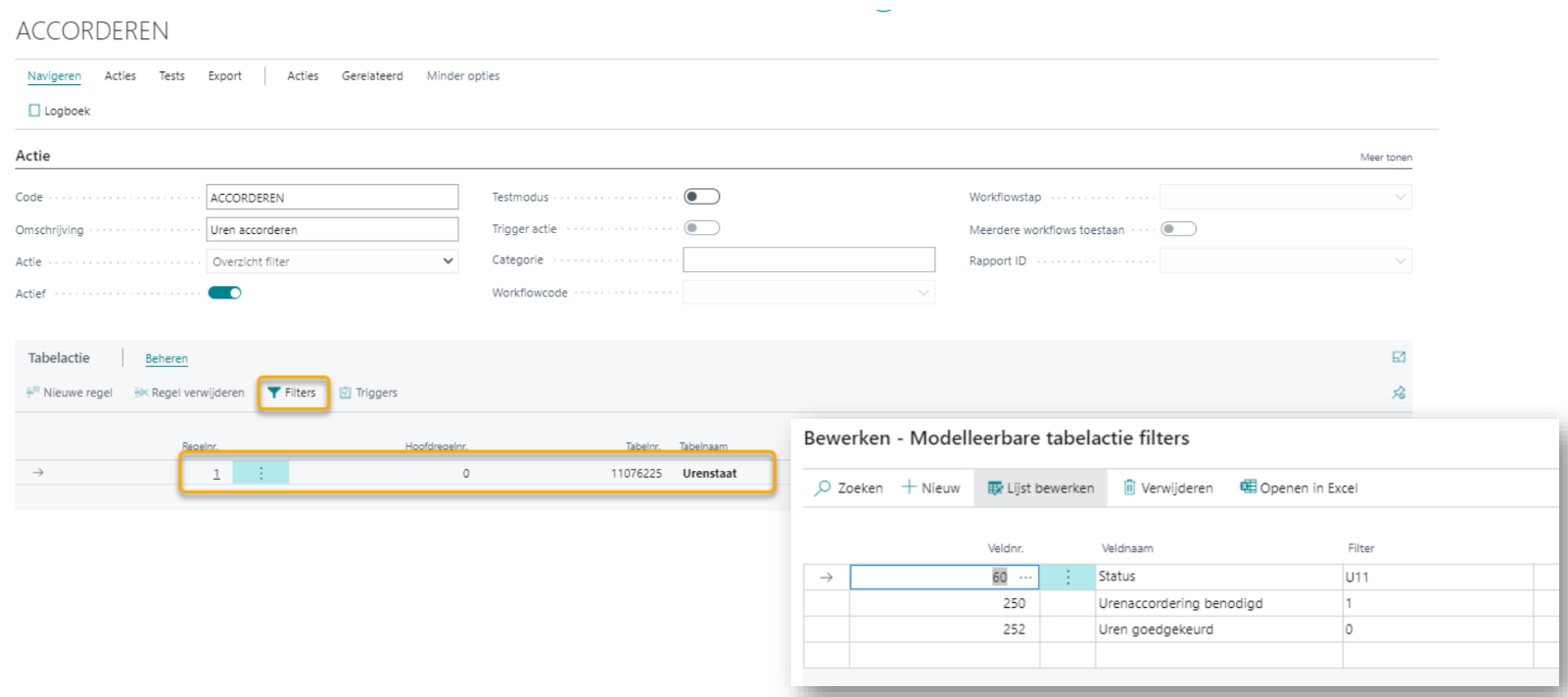U opent de pagina Modelleerbare tabelactie filters vanuit de sneltab Tabelactie van de MA. Selecteer de regel met de tabel waarop u een of meer filters wilt instellen en klik op de actiebalk van de sneltab op de knop Filters.