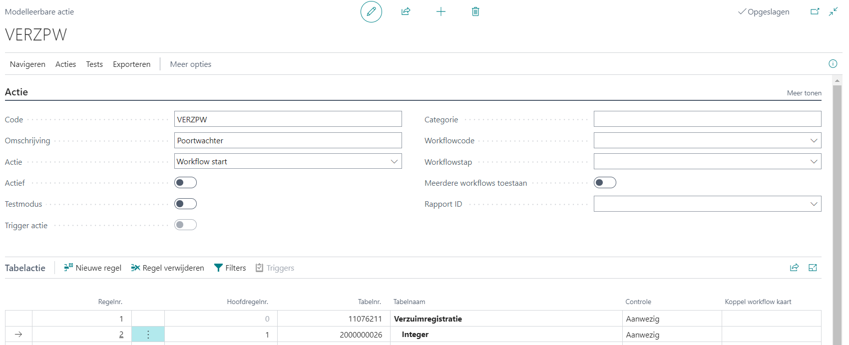 Hiertoe maakt u een modelleerbare actie aan met in de sneltab Tabelactie een regel met tabelnummer 11076211 (Verzuimregistratie) en een tweede regel met tabel 2000000026 (Integer).