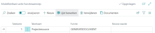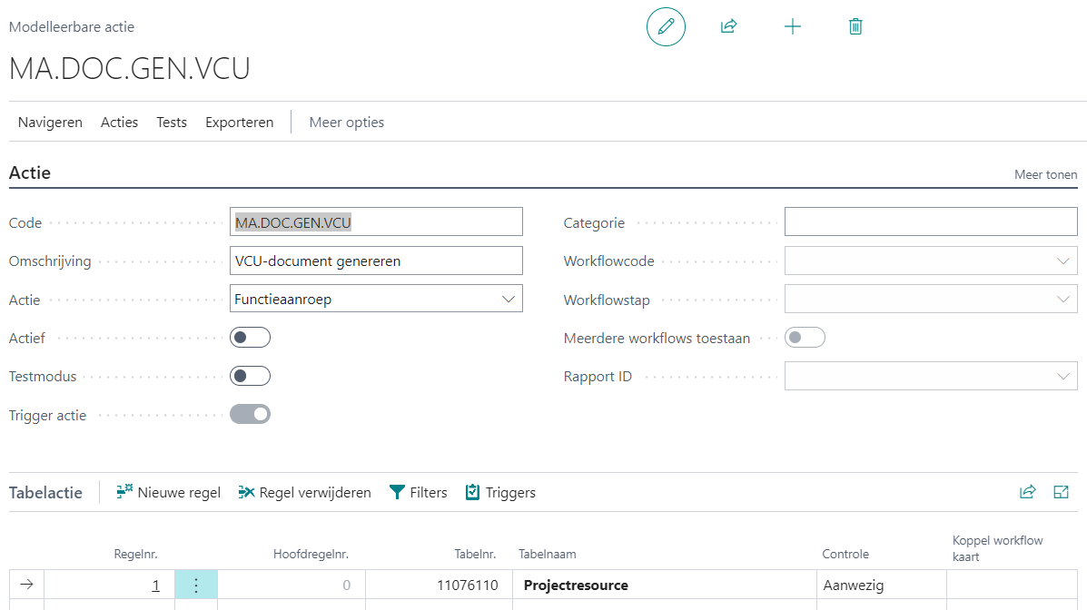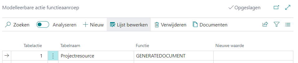 - Kies bij Tabelactie nummer 1 (de projectresourcetabel) en kies bij Functie voor Generate Document (of vul GENERATEDOCUMENT in).
