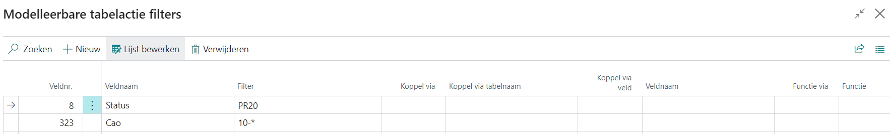 Voeg op de pagina Modelleerbare tabelactie filters 2 regels toe: