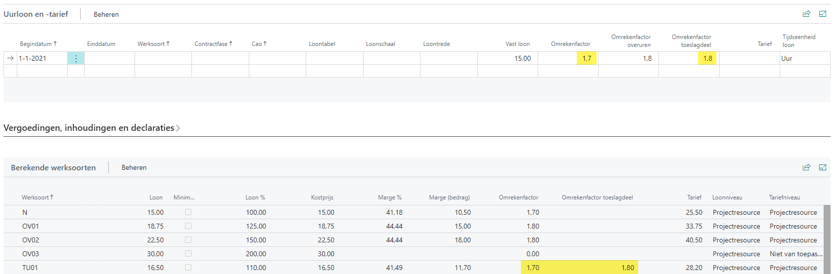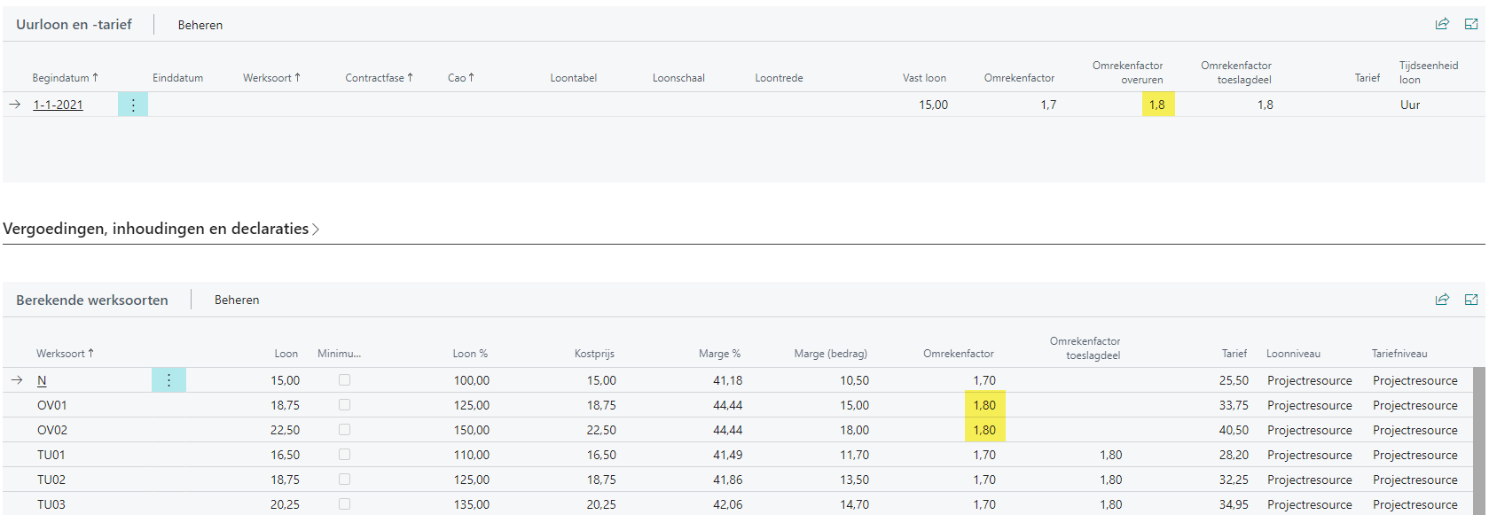 De omrekenfactor overuren van 1,8 wordt volledig toegepast op overuren. Het tarief van 33,75 voor werksoort OV01 in het voorbeeld is opgebouwd uit 18,75 * 1,8.