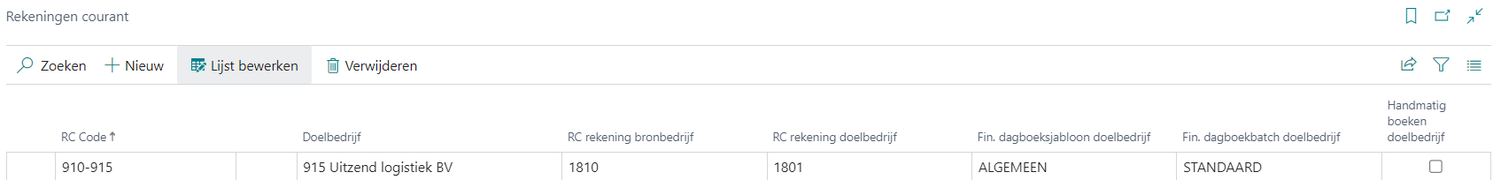Voorbeeld: In onderstaand voorbeeld is 915 het doelbedrijf. Dus vanuit bedrijf 910 moet geboekt kunnen worden op een rekening in bedrijf 915. Met als tegenrekening in bedrijf 915: 1801