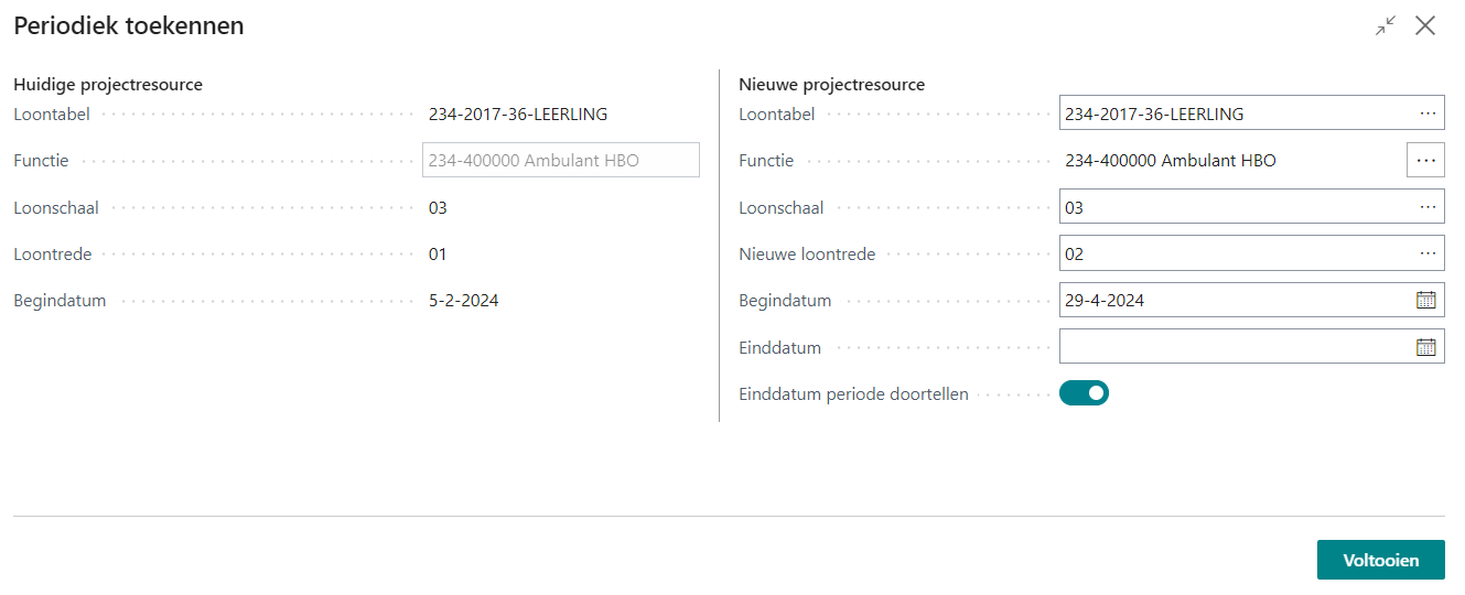 Via de pagina Periodiek toekennen kunt u een periodieke loonsverhoging toekennen aan een projectresource. Hiermee maakt u een nieuwe projectresource aan met de ingestelde loontabel, functie, loonschaal, loontrede en ingangsdatum. De al bestaande projectresource wordt automatisch beëindigd.