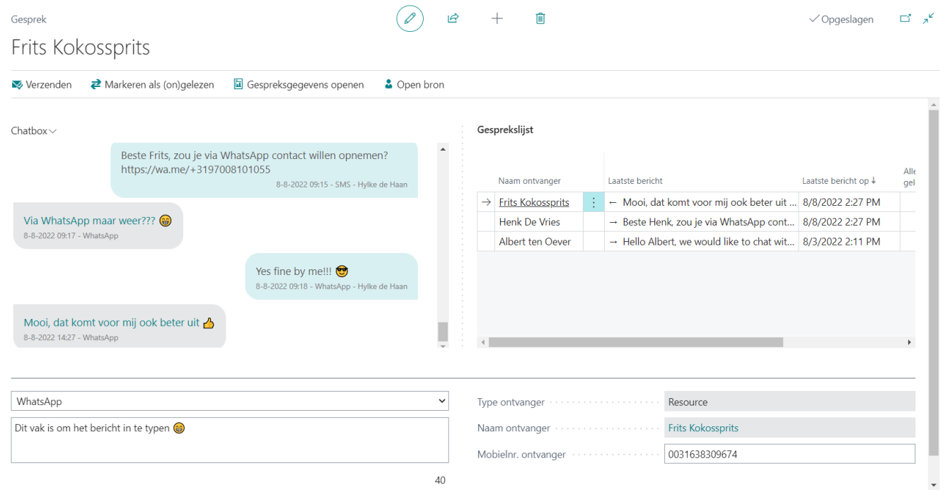 Deze pagina is van toepassing voor het sturen van sms- en WhatsApp-berichten naar resources en contactpersonen via het Business Messaging Platform van CM. Het toont ook een gesprekslijst met bestaande gesprekken.