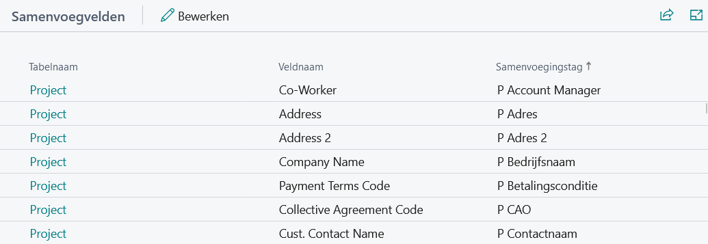 Via de knop Bewerken opent u de pagina Samenvoegvelden, waarin u nieuwe samenvoegvelden kunt toevoegen (als u daar rechten voor hebt).